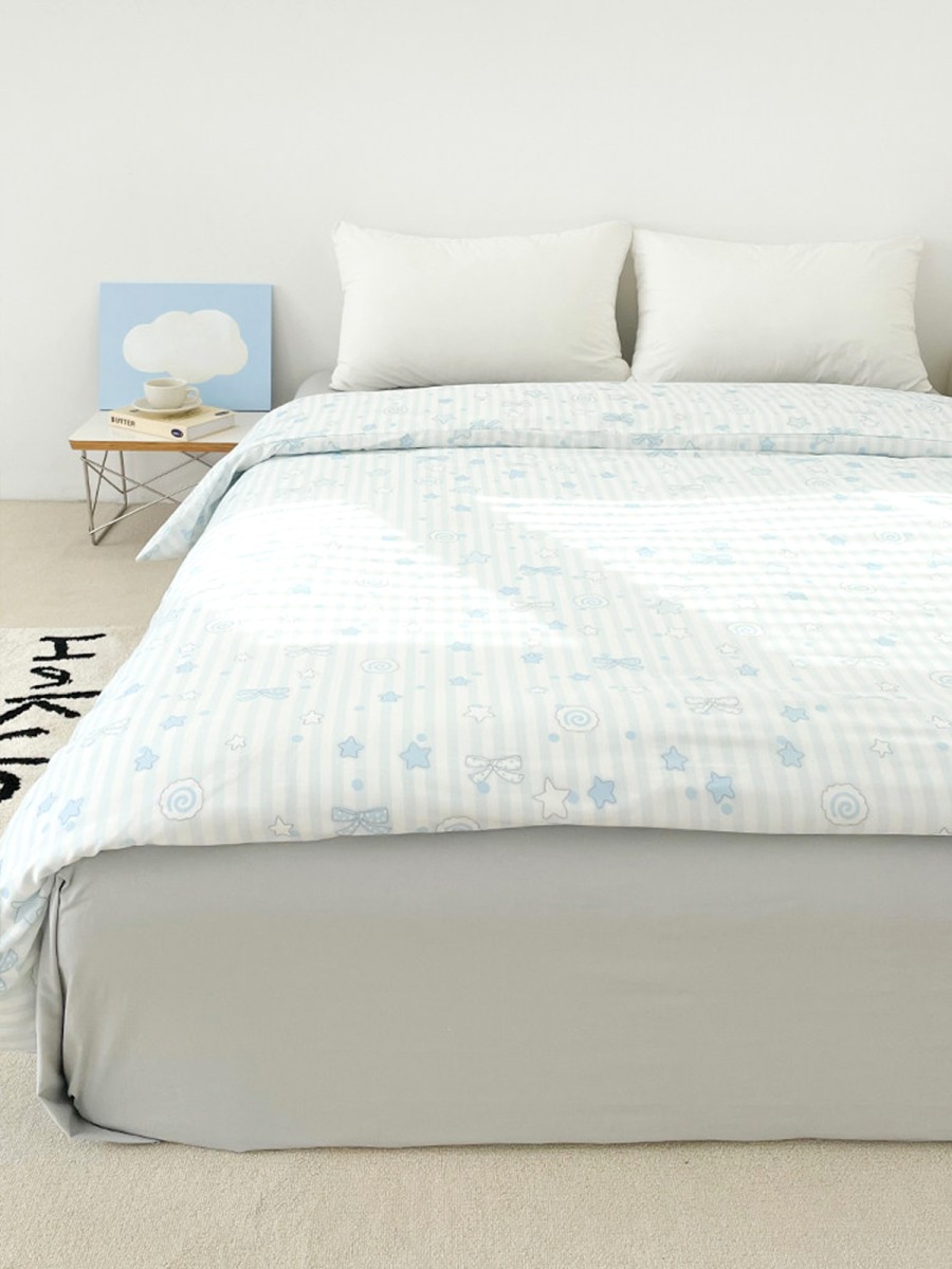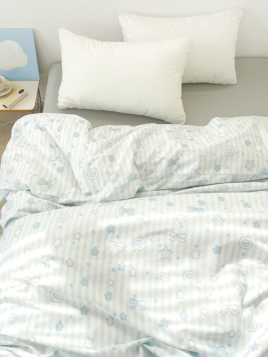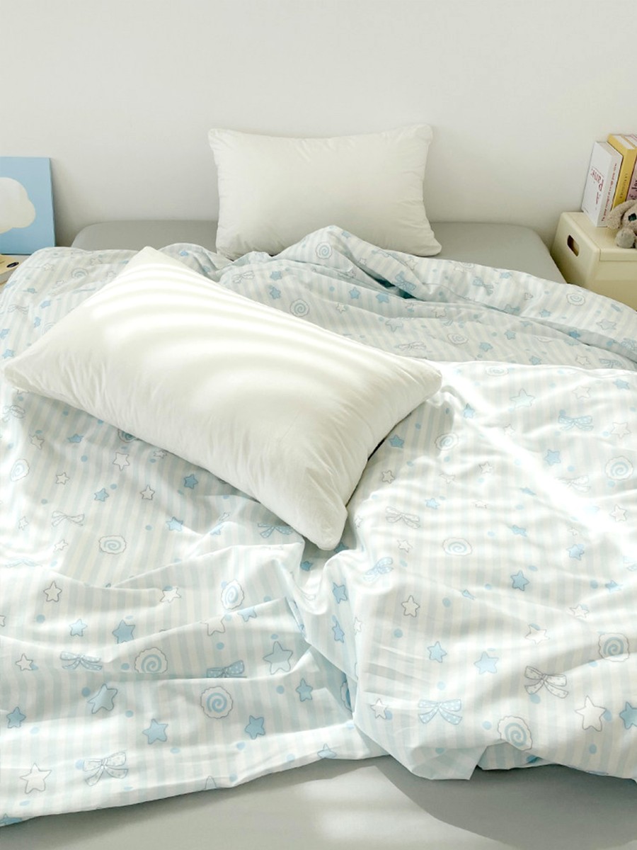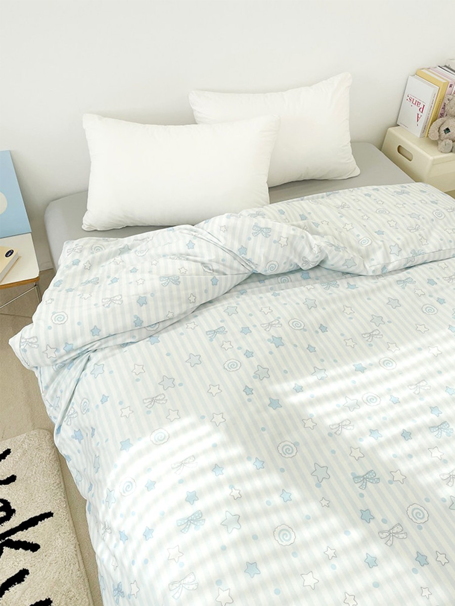 Print Design: The duvet cover features blue stripes as the main color, embellished with cute star prints. The overall style is fresh, simple, and playful, creating a tranquil and comfortable sleeping atmosphere. The orderly stripes combined with the lively star element give the bedroom a sense of order while being full of warm childlike fun.