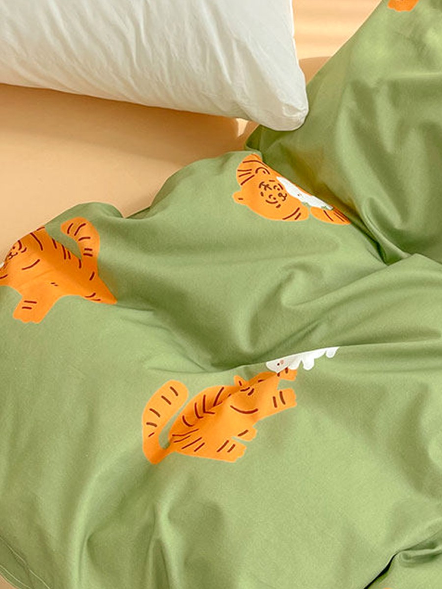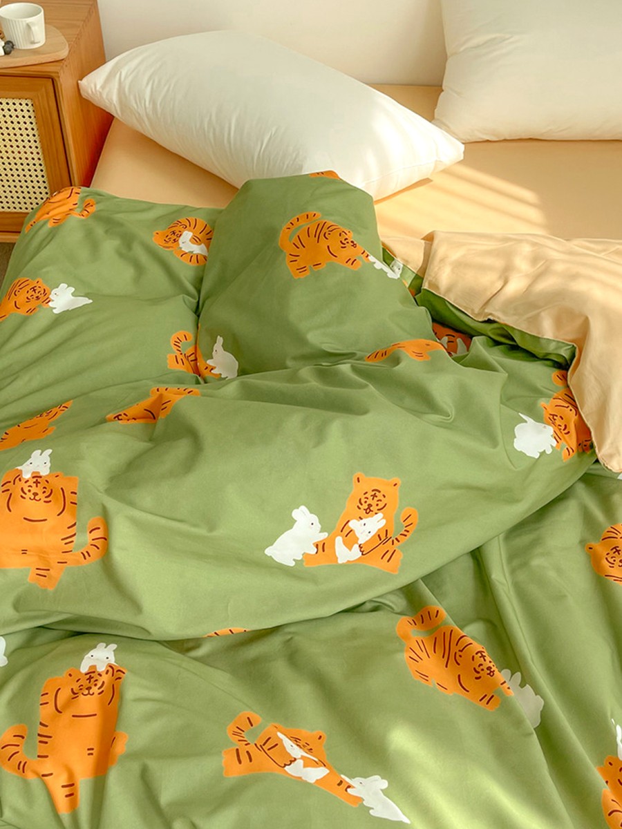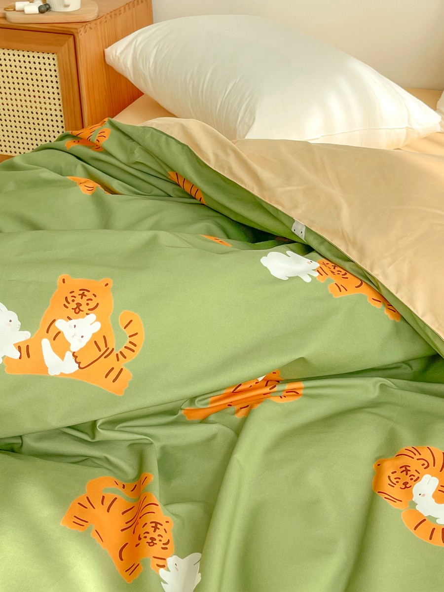 Cartoon Tiger and Rabbit Print Design: This duvet cover features a lively and adorable tiger and rabbit theme, paired with a refreshing green background. The overall design is playful yet gentle. The cartoon characters are vivid and approachable, injecting a relaxed and cheerful atmosphere into the space without being overly flashy, making it suitable for creating a warm and comforting bedroom environment. Whether for children's rooms or adults who prefer a cute style, it provides a sense of companionship and reassurance.