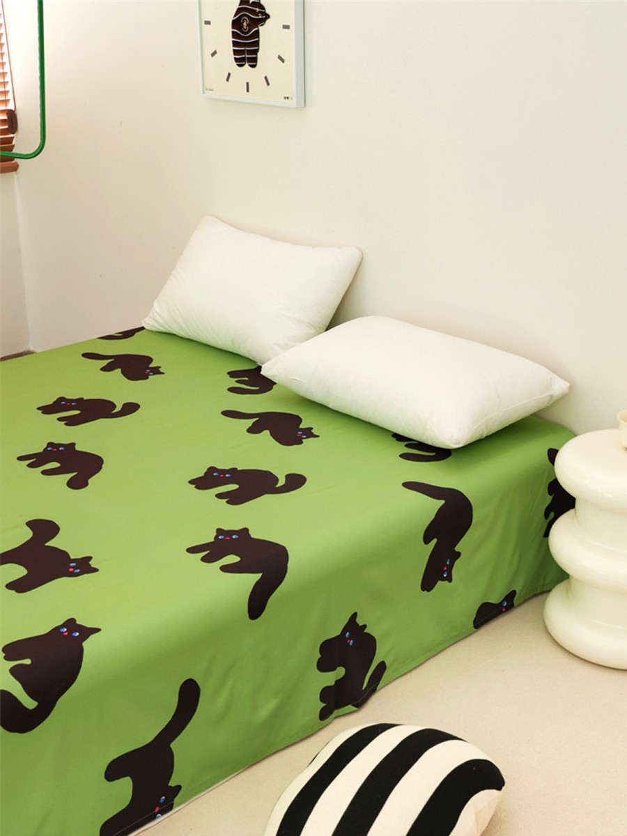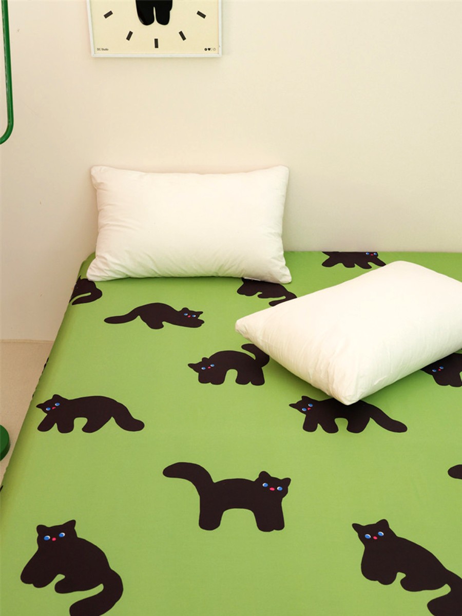 Black Cat Print Design: A fresh and natural green base is adorned with playful black cat prints. The cat's clear, bright blue eyes and playful red nose seem to disappear quietly into the night, yet also subtly accompany the room, adding a gentle and soothing atmosphere to the bedroom.